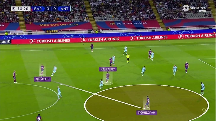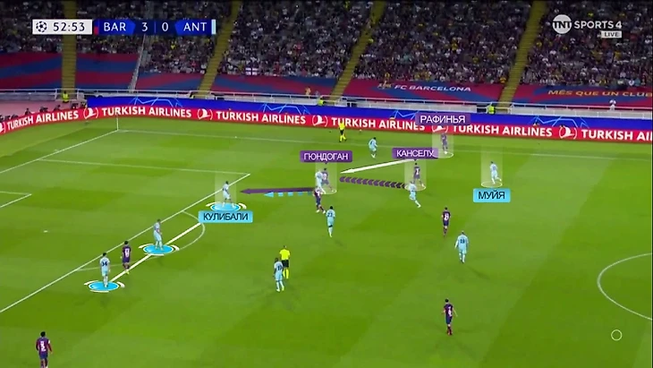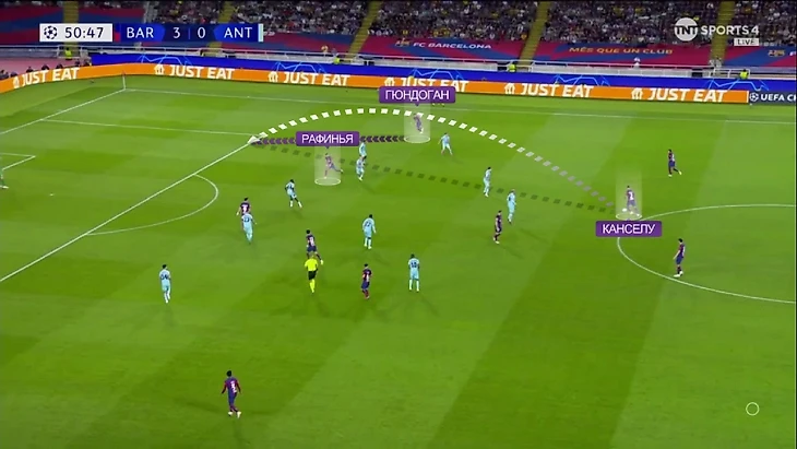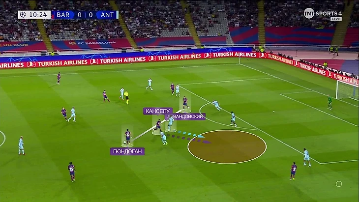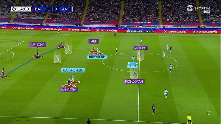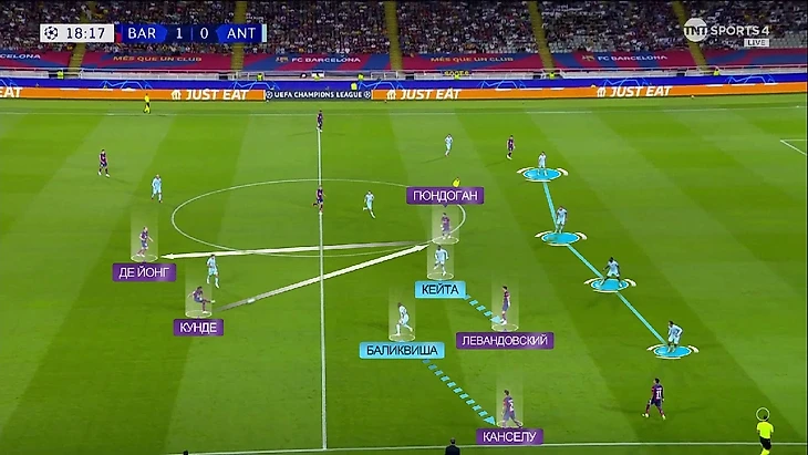 Вот ещё один пример: опять Френки в линии с защитниками и снова ситуация 3-в-2. С Гави и Канселу плотно играют, а вот Кейта уже разрывается между Феликсом и Гюндоганом: