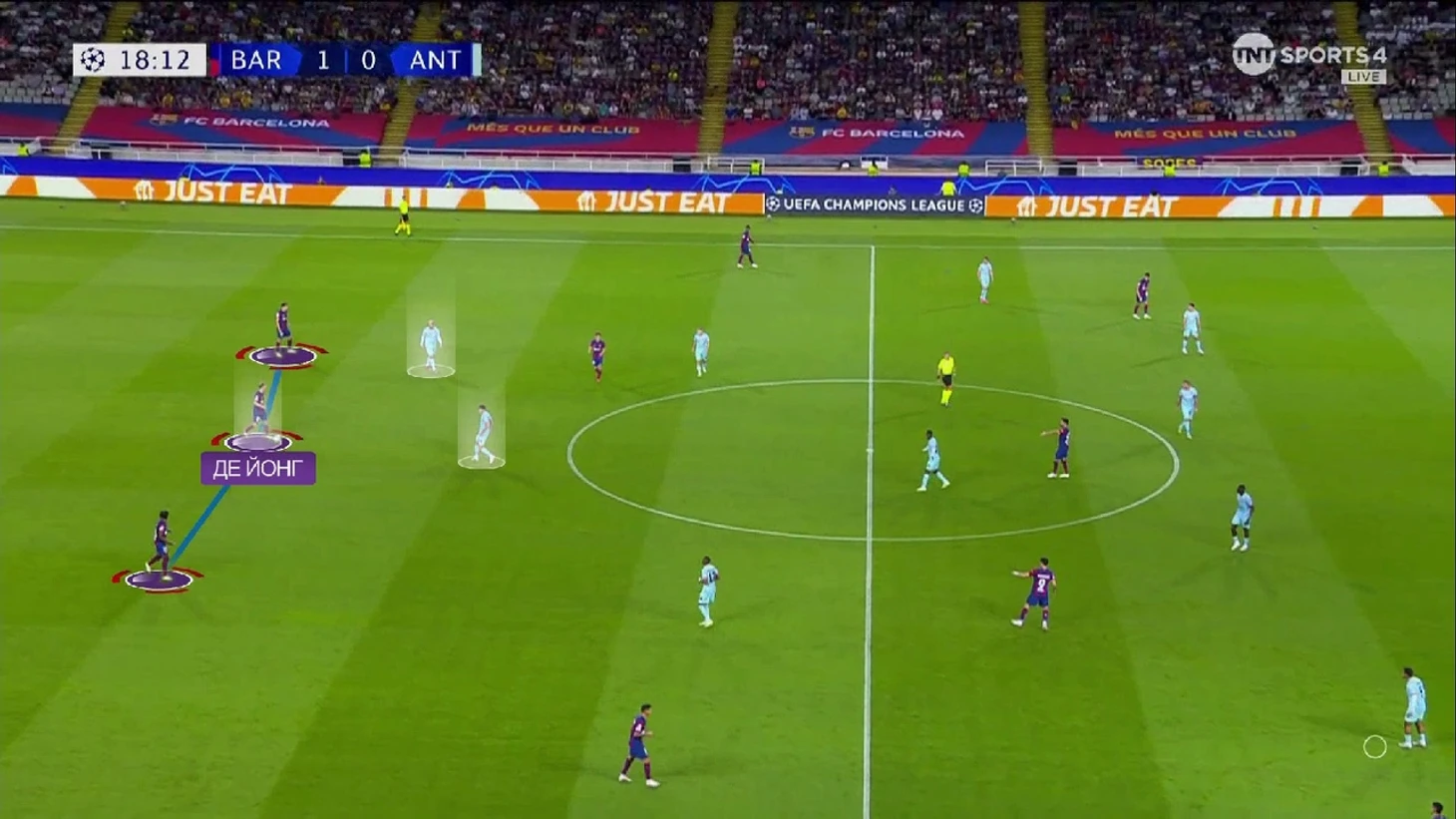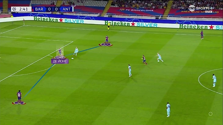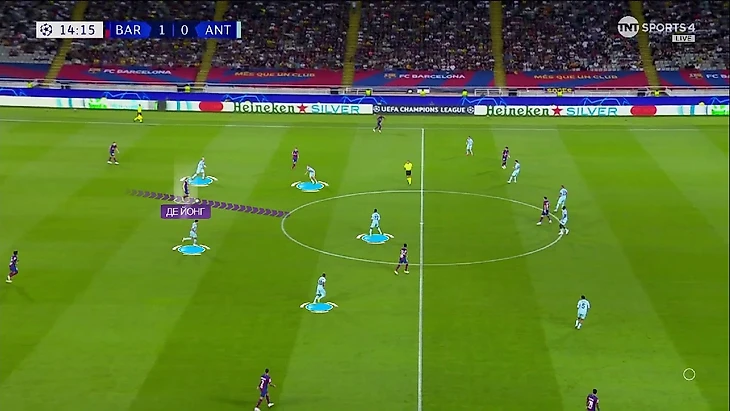Ориоль Ромеу выходил в старте во всех матчах этого сезона, но вот на встрече с «Антверпеном» эта серия прервалась. Видимо, Хави посчитал, что рисунок матча будет более однобоким чем обычно – постфактум он оказался прав, но это не было так очевидно до начала встречи. Честно говоря, я думал, что Гюндоган выйдет на позиции разыгрывающего опорника, но в итоге там стартовал де Йонг. Ожидаемо, он действовал в иной манере, чем Ромеу – много двигался по полю и, по сути, играл в довольно свободной роли. В первую очередь эти изменения отразились в стадии билд-апа – де Йонг постоянно «падал» и образовывал тройку в первой стадии: