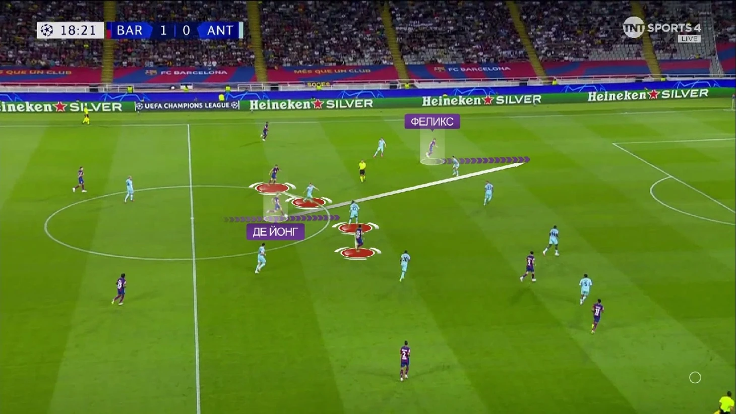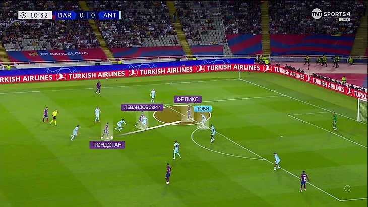 Дальше де Йонг снова проходит с мячом без сопротивления и выдаёт просто гениальный пас на Феликса. Жаль, что такие передачи не попадают в протокол матча.