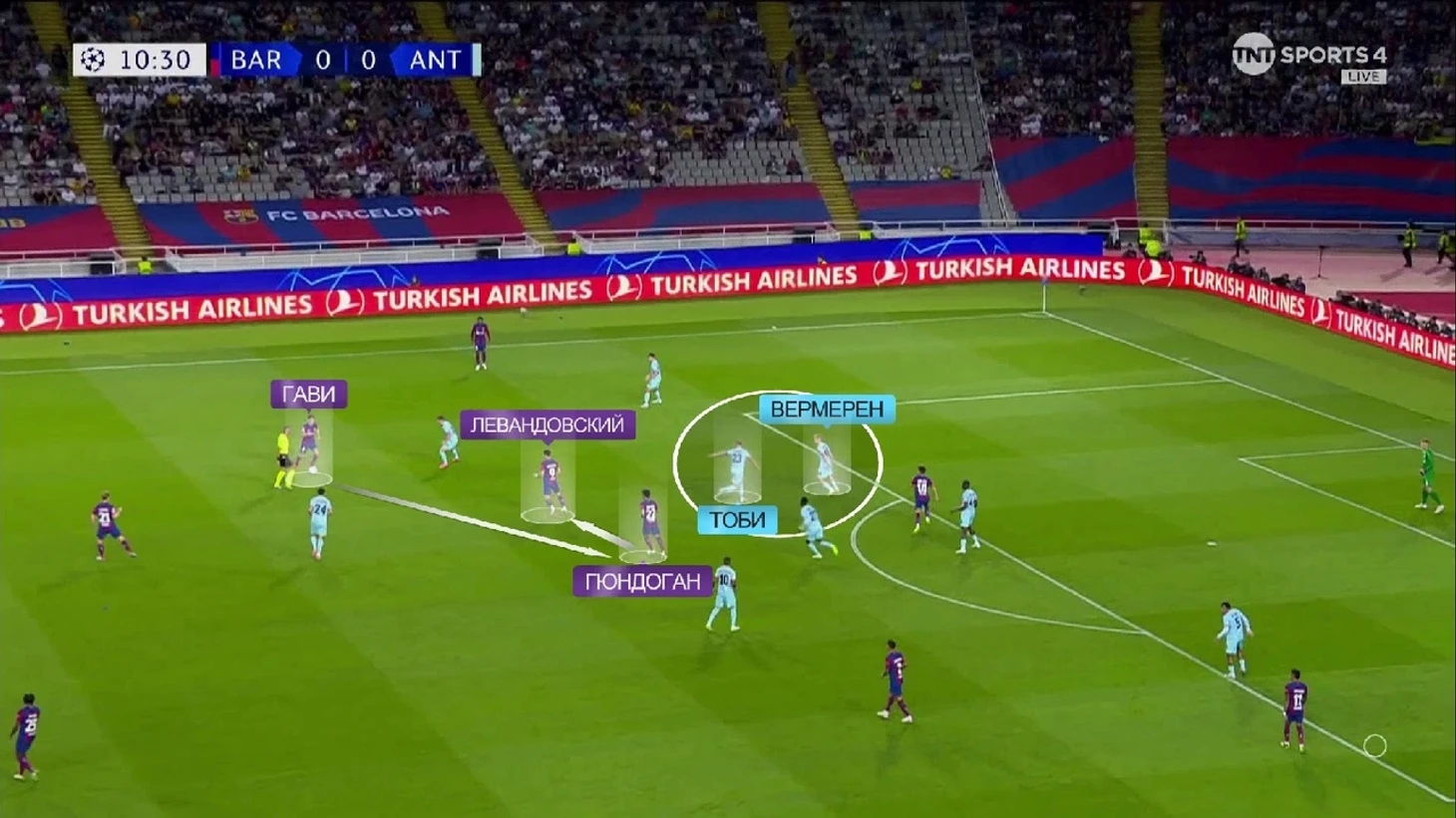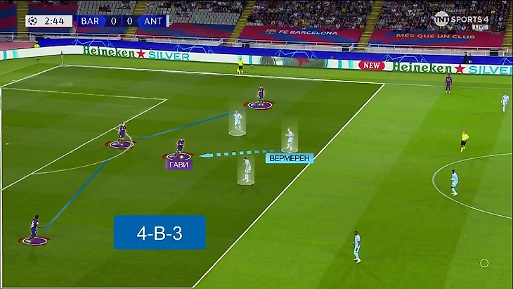 В данном случае польза от этого манёвра очевидна – «Антверпен» прессингует с двумя игроками впереди и Френки в линии с защитниками позволяет иметь преимущество 3-в-2 в первой стадии. А если, например опустится Гави и за ним пойдёт Вермерен (чаще всего он шёл за ним), то преимущество в первой стадии всё равно останется, только теперь ещё и больше игроков «Антверпена» удастся выманить:
