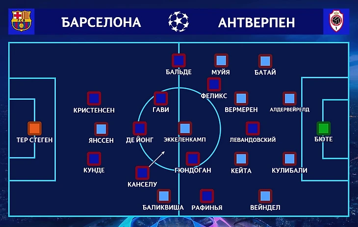 Ван Боммел не мог рассчитывать на четырёх игроков, но все они, кроме Сэма Вайнса, травмированы уже давно. А вот с американцем ситуация интереснее – он в любом случае пропустил бы матч с «Барсой» (травма), но из-за административной ошибки (заявили не того игрока вместо него) гарантировано пропустит весь групповой этап. Справа в обороне вышел вернувшийся из аренды Вейндел – это относительная интрига, потому что до этого там чаще всего выходил Де Лат. В остальном же абсолютно ожидаемый состав.