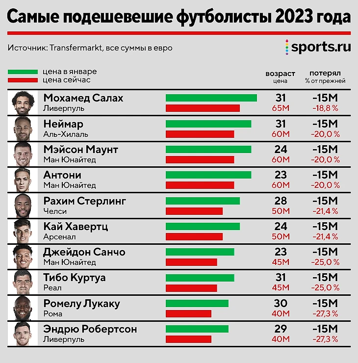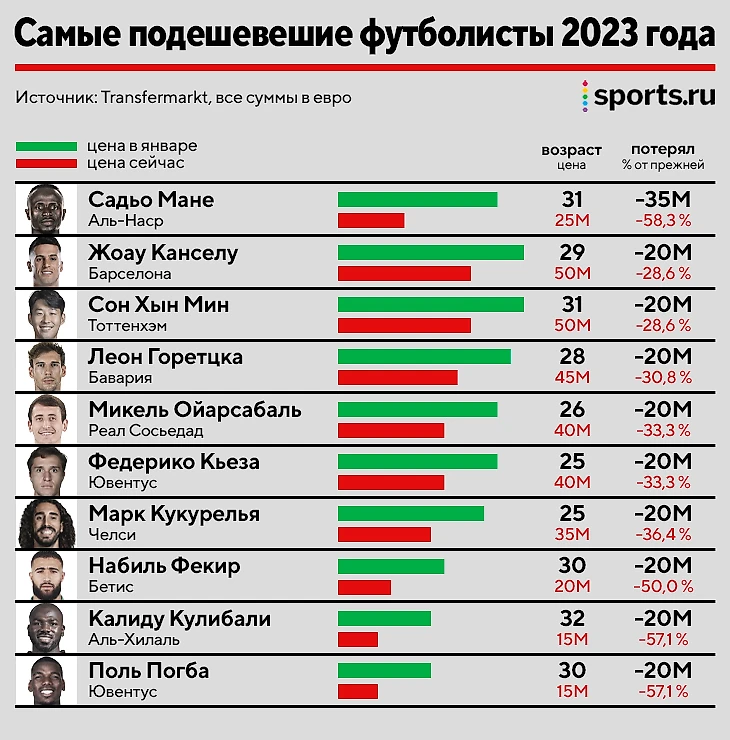 Мы зафиксировали топ-20 главных падений. Ключевой критерий ранжирования – потерянная часть стоимости игрока (именно поэтому Мане первый). Но для контекста мы добавили и процентное падение от трансферной стоимости на 1 января (стартовая точка отсчета).