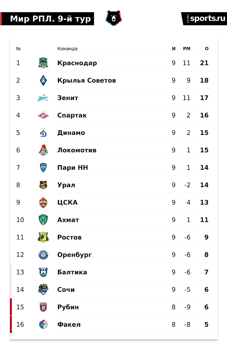 Что еще любопытного по итогам почти всех матчей 9-го тура РПЛ видим в таблице?
