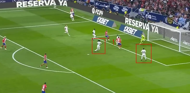 Гризманн подключает Сауля. Лукас мчится закрывать его, бросая Лино. Алаба, который играет по Морате, остается один против двоих (Лино очень опасно врывается уже во вратарскую). Рюдигер остался далеко позади и никак не успевает