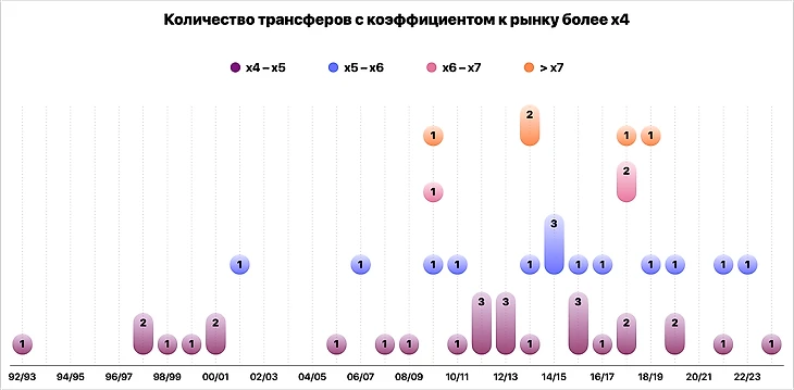 Например, первым футболистом, за кого было заплачено больше х5 к рынку стал Зинедин Зидан в сезоне-2001/02. Отметку x4 преодолевали только 7 трансферов до него и только 4 – в течение семи лет после него.