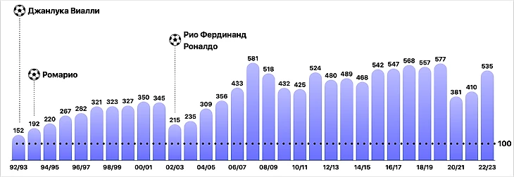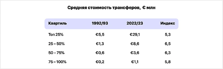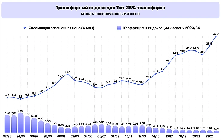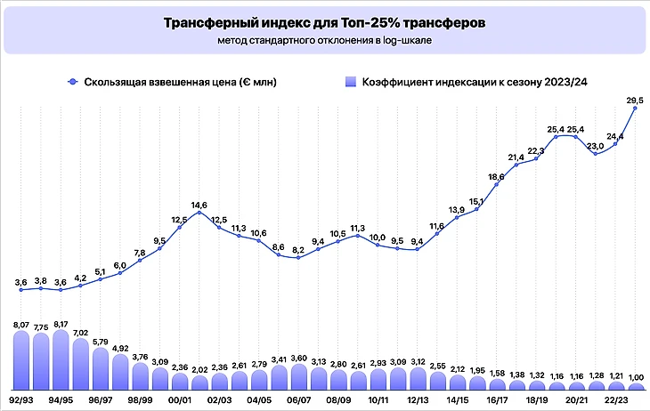 В итоге в расчет средней стоимости сезона-1992/93 попало большое количество дешевых трансферов и существенно ее занизило. Чем она меньше, тем выше индекс инфляции к текущему году.