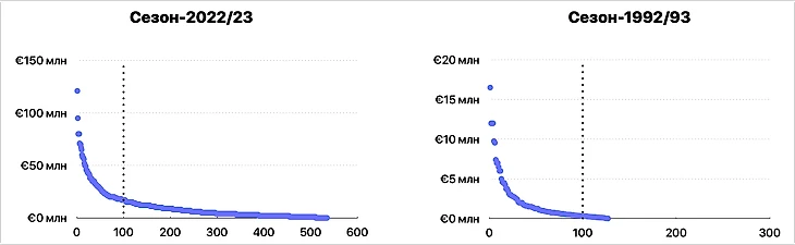Если в сезоне-2022/23 топ-100 трансферов составляет около 18% от их общего числа, то в 1992/93 – это целых 79%. Произошло то, что обычно называется смещением выборки.