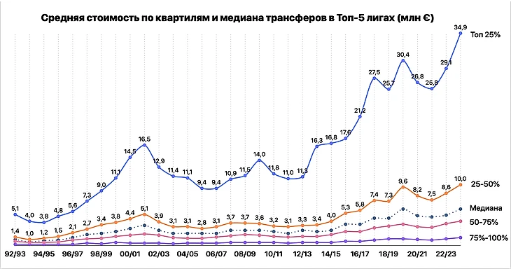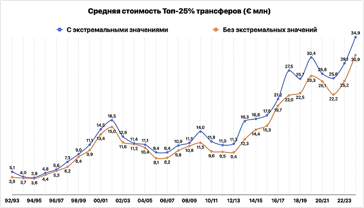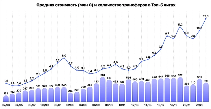 Возьмем с Transfermarkt трансферы по топ-5 лигам за период с 1992 по 2023 год и посчитаем среднюю стоимость по сезонам без каких-либо корректировок (сезон-2023/24 – только за летнее трансферное окно).