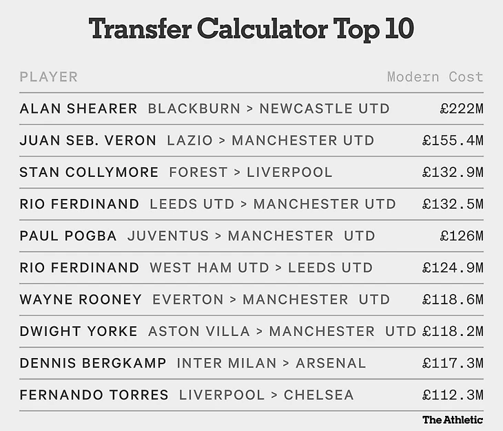 Самым дорогим в индексе The Athletic указан трансфер Алана Ширера в Ньюкасл в 1996 году за 222 млн фунтов. При фактической цене в 15 млн фунтов, индекс инфляции составляет 14,8.