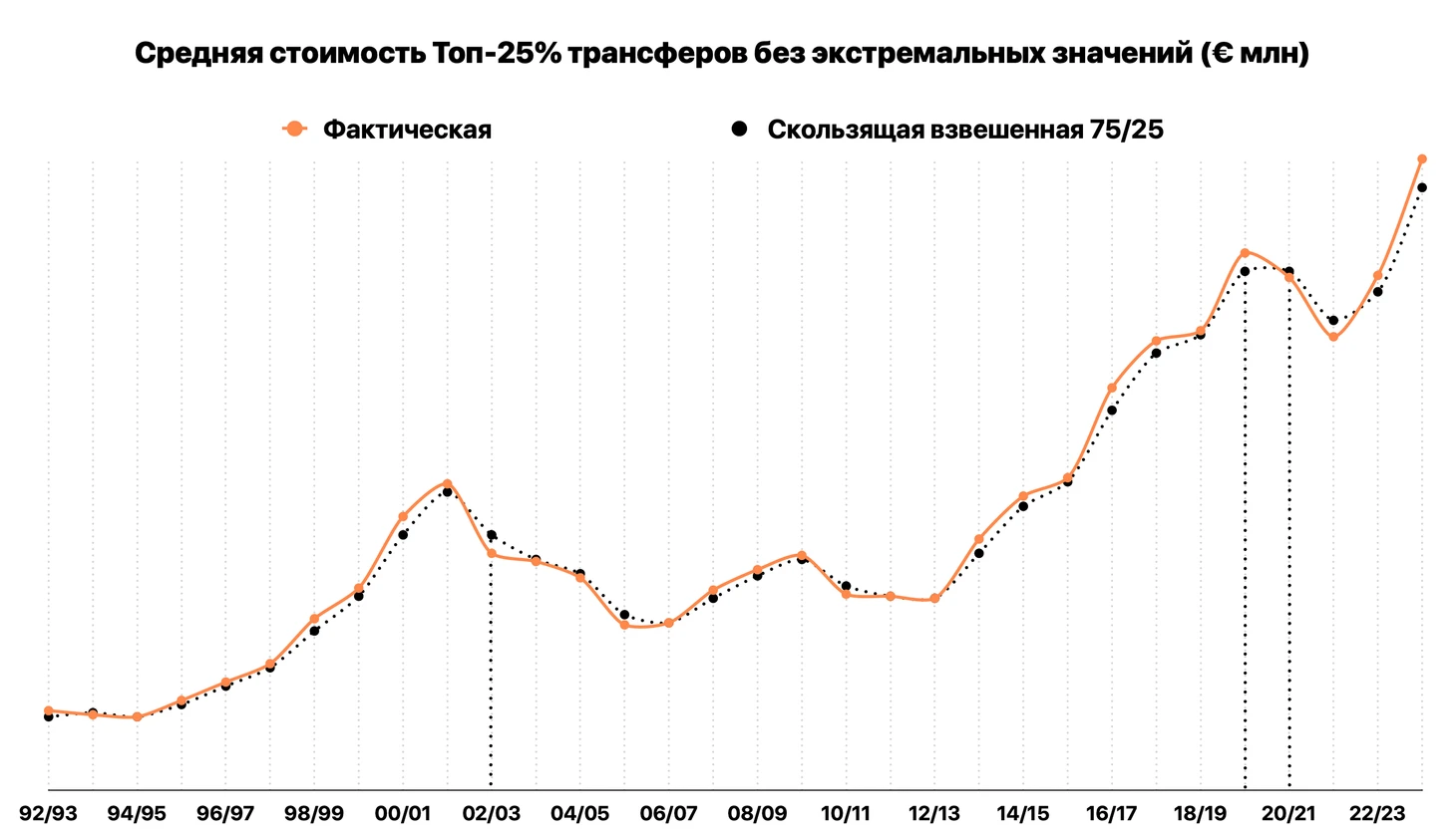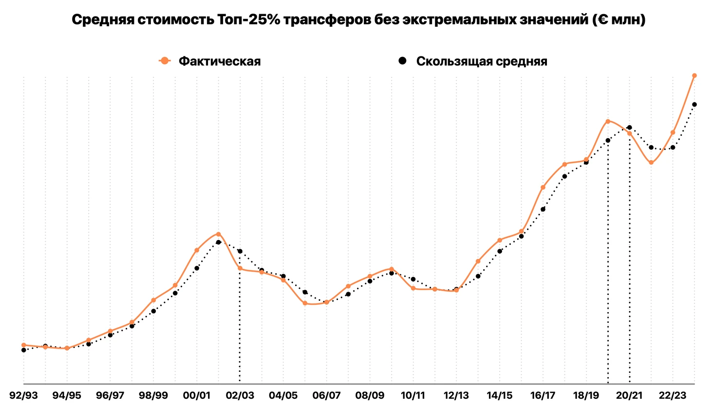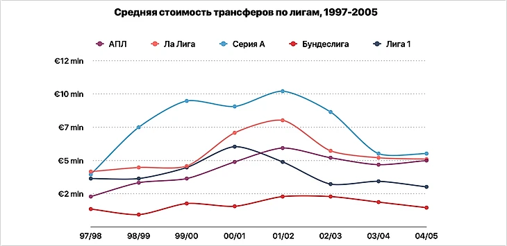 Фактически около 10 лет она «плавает» в одной области. Локальный пик 2009/10 – влияние топовых трансферов Роналду, Ибрагимовича и Кака, без которых средняя стоимость составила бы 4,4 млн евро.