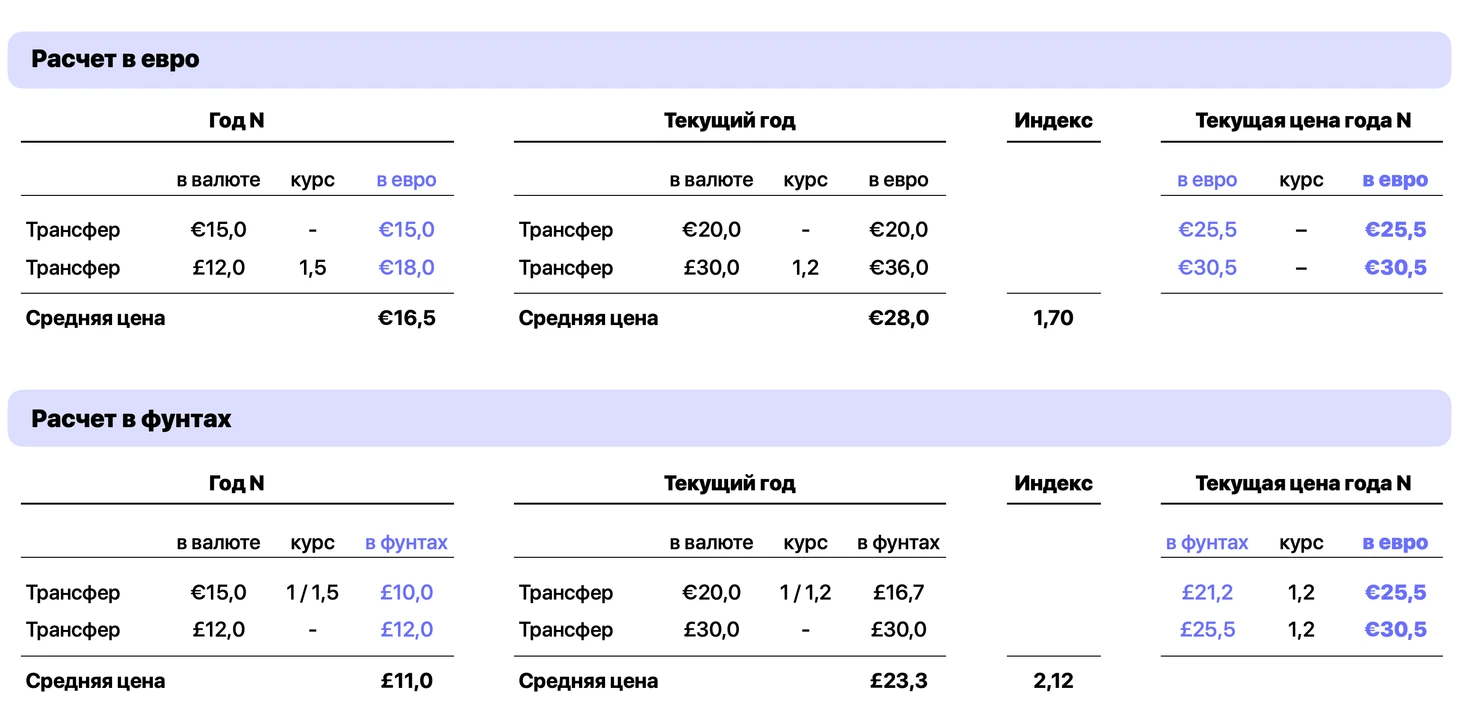 И фунт, и евро свободно конвертируются. Неважно, в какой валютной единице выражается стоимость трансферов (Transfermarkt делает это в евро, но можно было бы и в фунтах), экономически – это одна и та же сумма денег. От какой бы валюты не был посчитан индекс – конкретные цифры индекса для разных валют будут отличаться, но экономически – это одна и та же инфляция активов с тем же результатом.