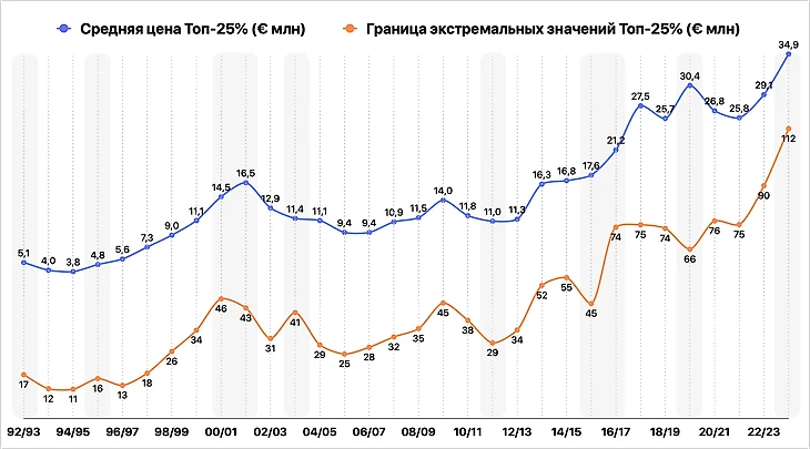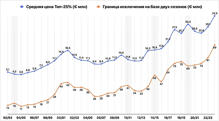 Уверенный рост начинается после повышения ТВ-контрактов в 2013/14 и идет вплоть до корректировки в двух сезонах после ковидного локдауна («скачок» 2017/18 – из-за трансферов Неймара, Коутиньо и Дембеле, без их учета средняя стоимость – 8,8 млн евро).