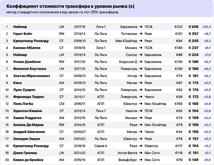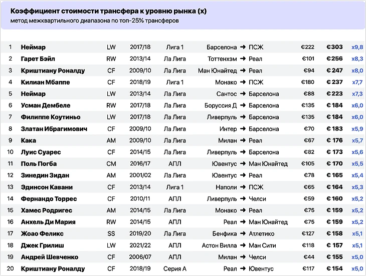 Например, фактическая цена перехода Неймара в ПСЖ – 222 млн евро. Среднерыночная цена топ-25% в сезоне-2017/18 – 21,4 млн евро. Отношение первого ко второму дает коэффициент х10,4 – он показывает, сколько раз Неймар был оплачен к среднему уровню рынка в году трансфера.