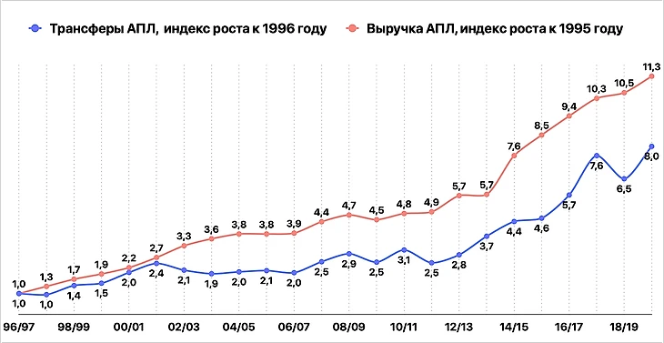 Берем данные с Transfermarkt и сравниваем темпы роста средней стоимости трансфера в АПЛ в 1996-2019 годах и выручки в 1995-2018 годах (в евро). Подход тот же – трансферы текущего сезона оплачивает выручка предыдущего.