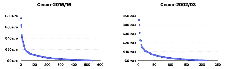 Показательно, что если в сезоне-2001/02 средняя стоимость топ-двадцати трансферов по всем лигам составила 34,3 млн евро (из них – 18 трансферов на 20+ млн), то в следующем – только 20,8 млн (8 трансферов на 20+). Снижение кардинальное.