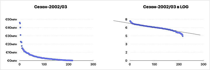 по каждому сезону берем трансферы текущего и предыдущего, сортируем в порядке убывания и переводим в LOG-шкалу;