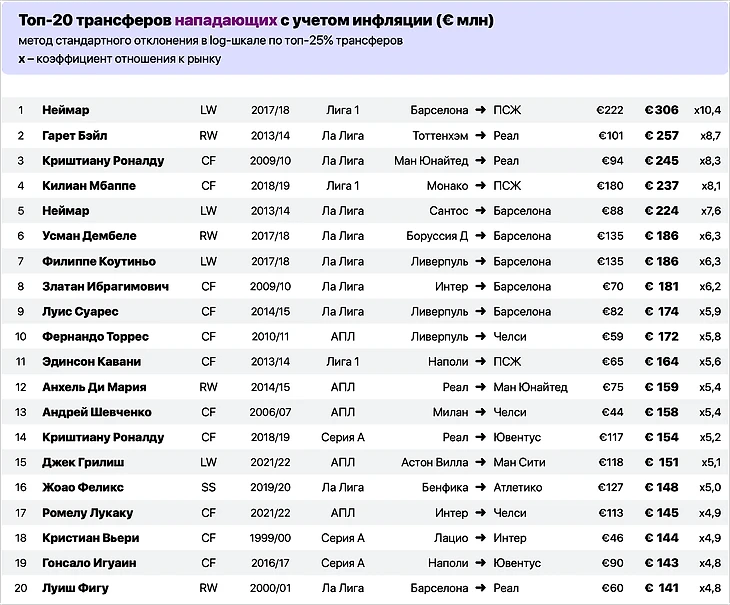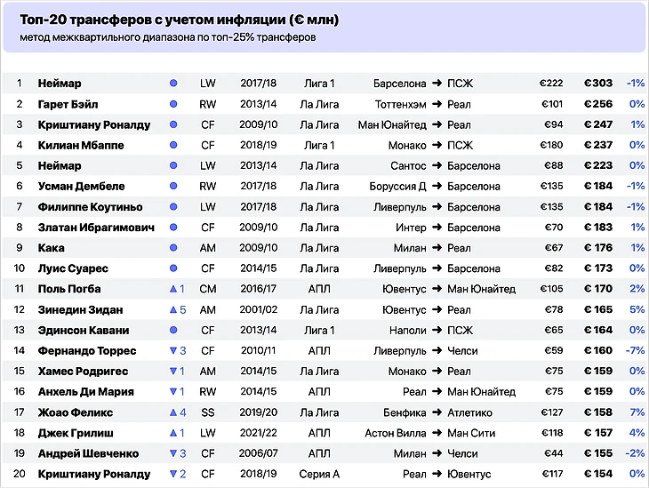 Поэтому чем больше было заплачено к среднему уровню рынка в году трансфера, тем выше и его стоимость в ценах 2023 года.