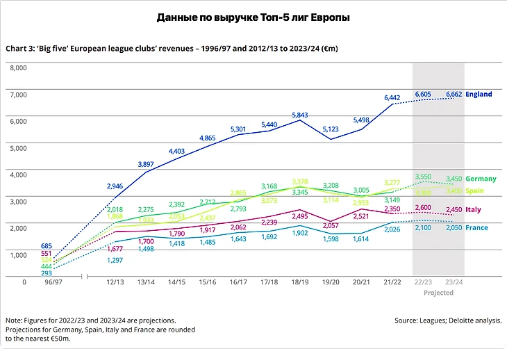 За сезон-2021/22 (последние на данный момент опубликованные данные по выручке) доходы клубов АПЛ минимум в два раза выше любой другой топ-лиги. Однако если взять доходы всех лиг вместе, то ее доля уже не выглядит «контролирующей»: клубы АПЛ заработали 6,4 млрд евро, клубы остальных топ-лиг – 10,6 млрд евро. То есть доля АПЛ в совокупном клубном обороте – 38%. Немало, но не подавляюще.