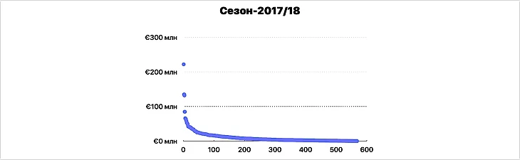 Еще один график. Три точки выше 100 млн – это трансферы Неймара, Филиппе Коутиньо и Усмана Дембеле.