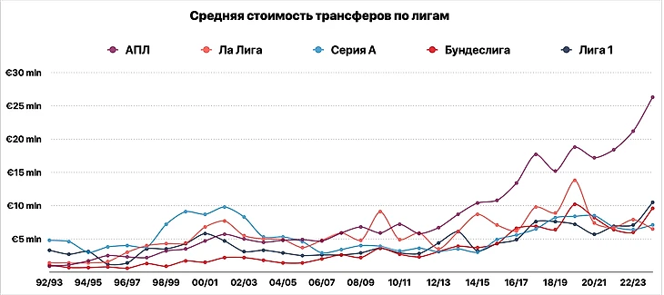 График средней стоимости трансферов в разрезе лиг (включая летнее окно сезона-2023/24) тоже впечатляет отрывом АПЛ, но говорит скорее о другом.