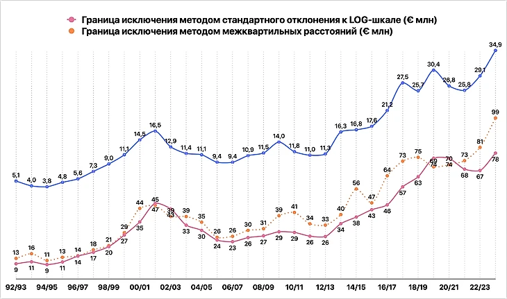 Но это не значит, что метод межквартильных расстояний будет работать хуже. Да, граница исключения у него в среднем лежит выше. Но так как она выше и для сезона-2023/24, к которому приводятся цены, то индекс по годам может быть сопоставим с предыдущим методом.