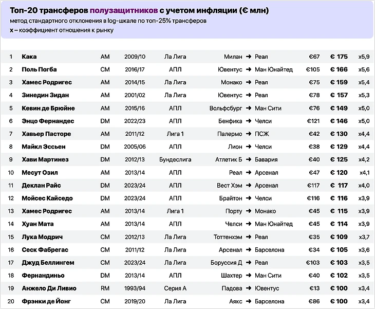 В топ-20 трансферов полузащитников только трансферы за 100+ млн евро, и Фернандес, Райс, Кайседо и Беллингем уже в этой компании. За защитников 80+ млн евро стали платить еще в 2000-x. А Зидан дороже Фердинанда.