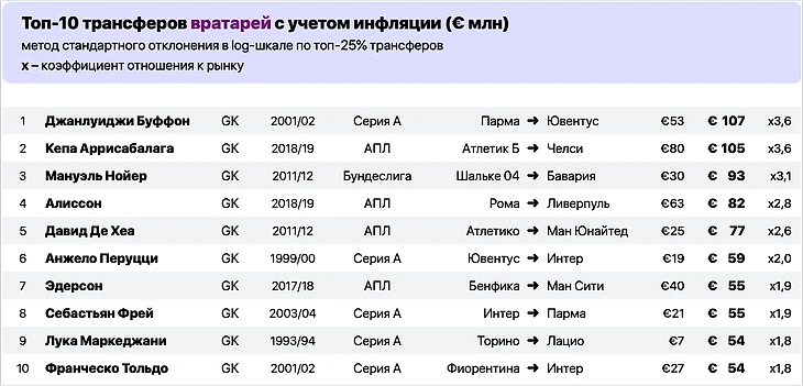 Однако у этого коэффициента есть и связь с инфляцией. Поскольку индекс мы считаем как отношение среднерыночной цены сезона-2023/24 к среднерыночной года трансфера, то умножая цену сезона-2023/24 на коэффициент мы, соответственно, получим его индексированную стоимость.