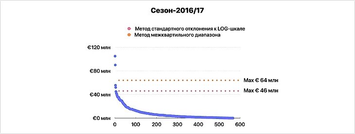 Отнесение трансфера к «экстремальному значению» означает, что мы исключим его из расчета среднерыночной цены, которую он существенно искажает. Посчитанный без этих искажений индекс будет применяться обратно ко всем, в том числе «экстремальным» трансферам.