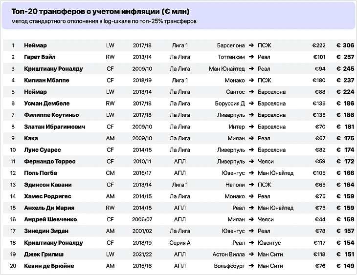 Средняя стоимость топ-100 трансферов в сезоне-1992/93 составила 2,4 млн евро, в сезоне-2022/23 – 34,2 млн евро. Получаем индекс инфляции 14,3 и стоимость Виалли примерно в 236 млн. Небольшое расхождение, но цифра почти такая же. Дополнительная проверка по Неймару дает аналогичный результат.