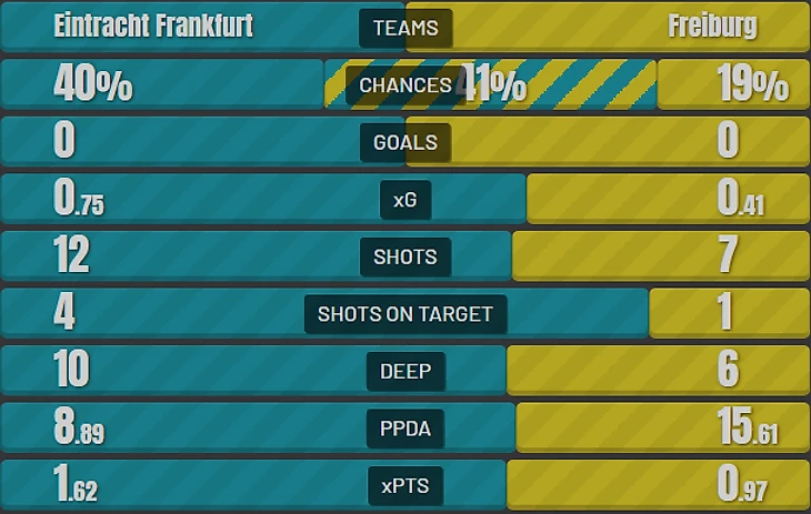 Единственную в туре без голевую ничью «Айнтрахт» расписали с «Фрайбургом. Трапп уже на первых минутах спас хозяев после удара головой Доана. Впоследствии отличился уже его визави, среагировав на дальний выстрел Шаиби. После перерыва команды снова обменялись опасными ударами (Мармуш-Грифо). «Фрайбургу» все же удалось забить уже в добавленное время, но арбитр сигнализировал об офсайде у Адама и игра завершилась с нулями на табло.