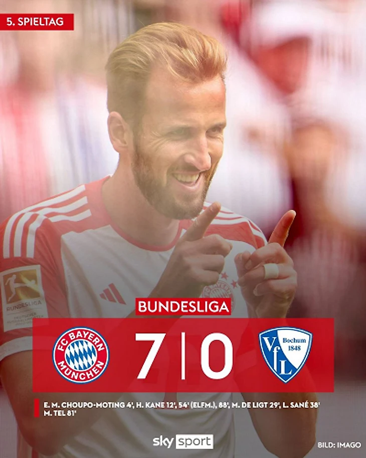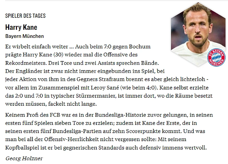 У Кейна – семь голов в первых пяти турах немецкого первенства. Ни одному игроку «Баварии» ранее не удавалось забить больше мячей за этот отрезок времени в своем дебютном сезоне Бундеслиги.