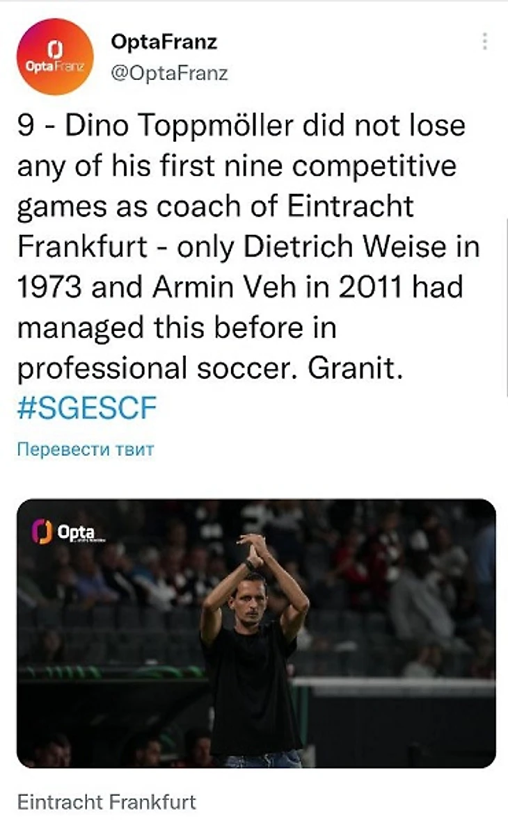 С момента назначения на должность главного тренера «Айнтрахта» Топмеллер не уступил ни в одном из девяти соревновательных матчей. До Дино это достижение покорилось лишь Дитриху Вайзу в 1973 году и Армину Фе в 2011 году.