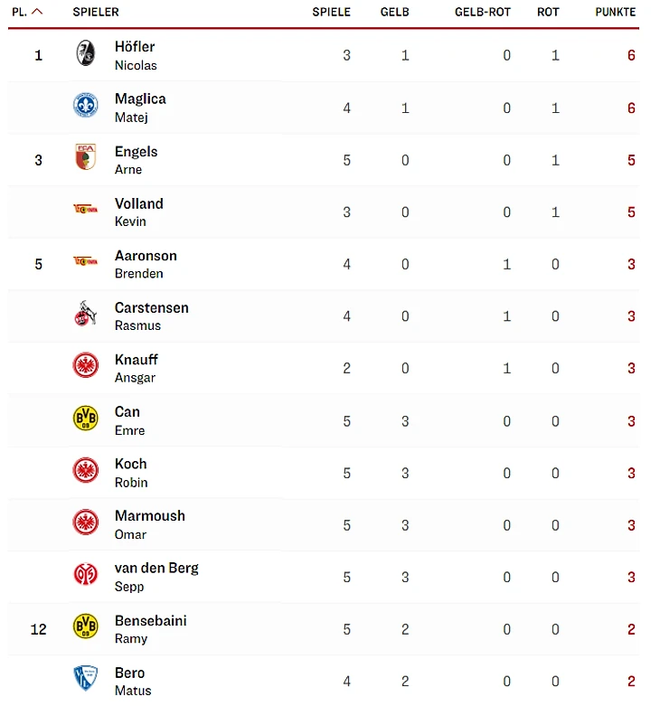 *игрок – кол-во игр – желтые – 1+1 желтые – красные – всего