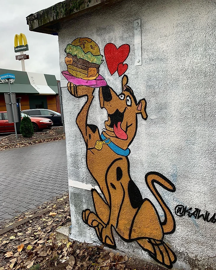 Но давайте вернемся к куда более доброму и приятному – детям. В 99% работ Каву используются образы мультипликационных героев. Вот тут, например, голодный Скуби-Ду аппетитно поднимает бургер над головой на фоне Макдональдса.