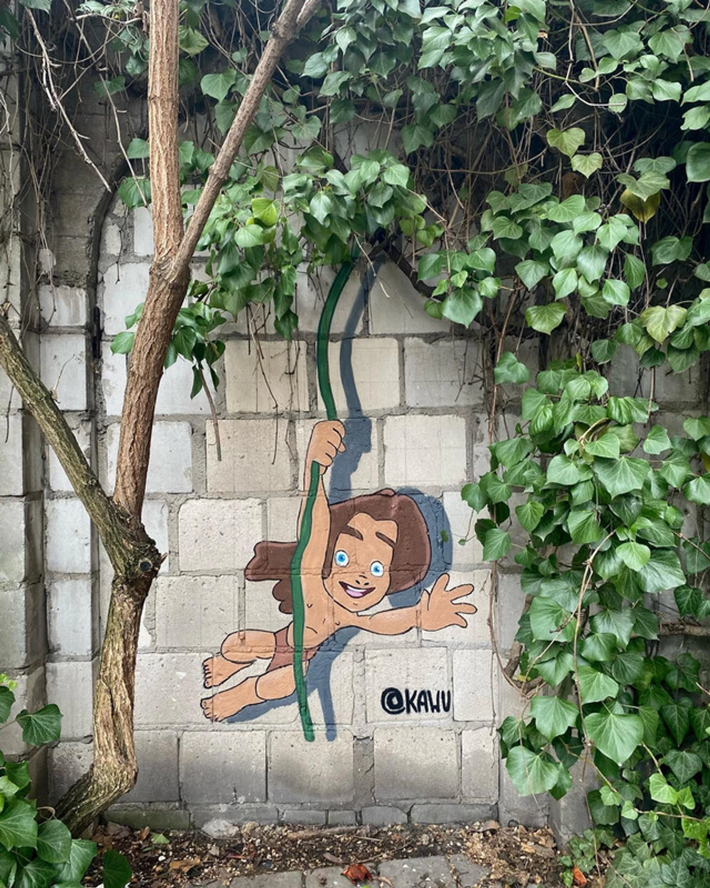 Изображение Маугли на городском каменном заборе, заросшим плющом. Нарисованная лиана очень органично сливается с настоящим плющом.