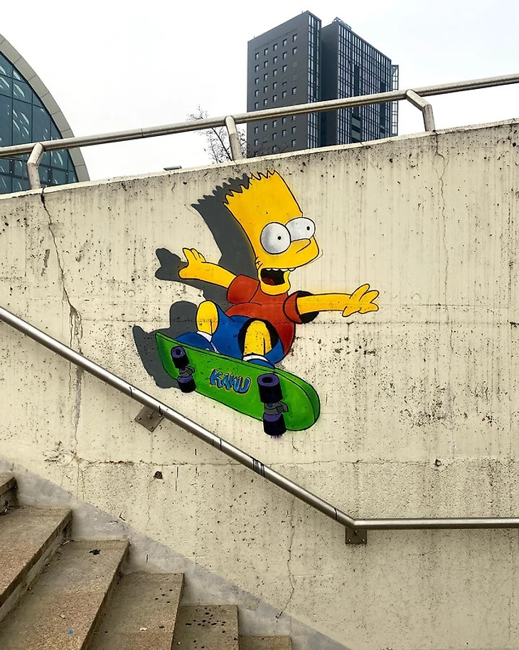 Необычное 3D-изображение Барта Симпсона, катающегося на скейтборде по настоящим поручням вдоль мрачной лестницы, ведущий в подземный переход.