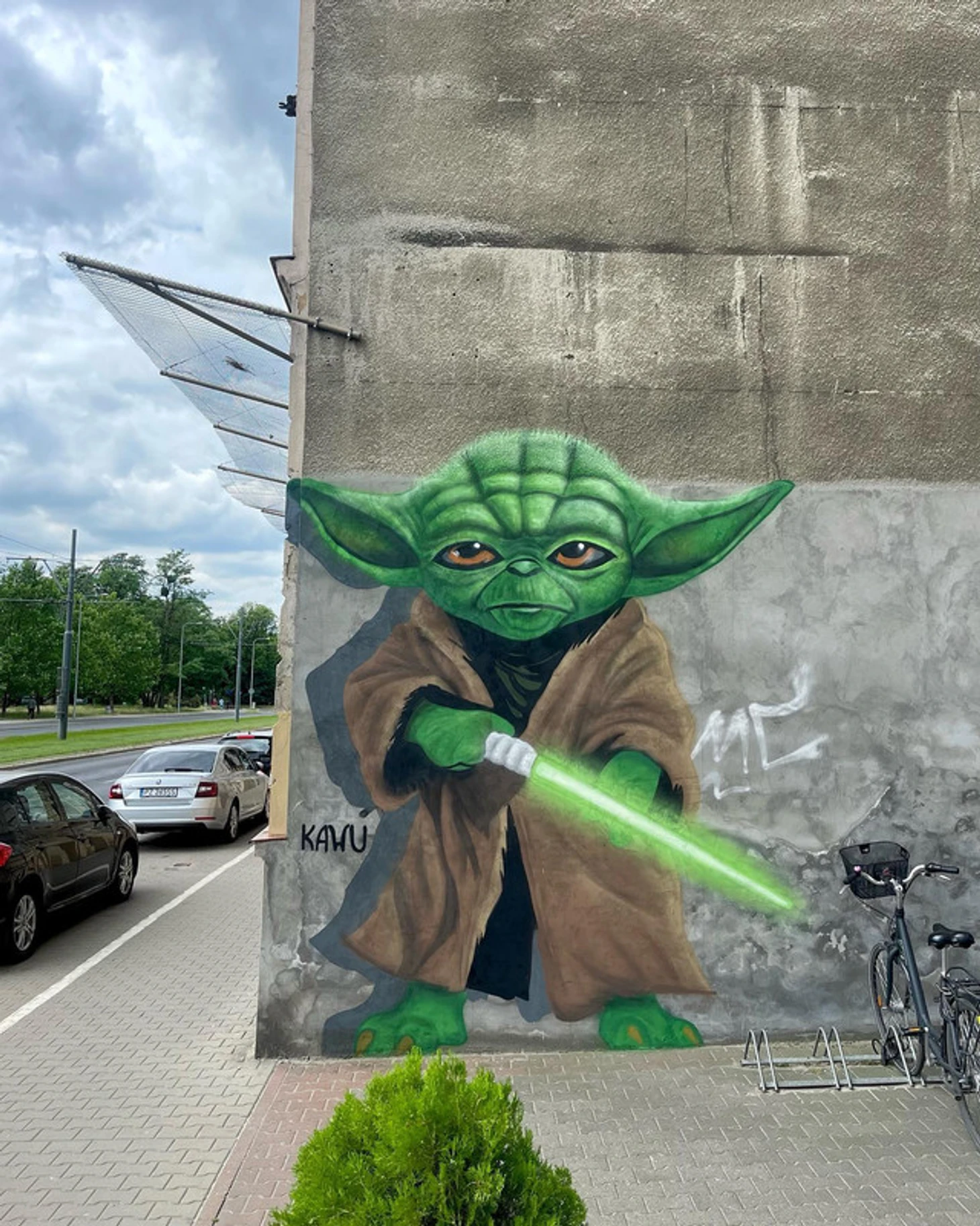 Еще одной современной экологической проблемой не только в Польше, но и во всём мире является загрязнение воздуха выхлопными газами автомобилей. Именно поэтому Каву призывает людей пересаживаться с авто на велосипеды: вот мастер Йода с помощью своего меча указывает людям на велосипедную парковку. Заодно и напоминает горожанам, что лучше припарковать своего двухколесного друга как положено, чем бросить где попало – к тому же в таком случае велика вероятность того, что у вас его украдут.
