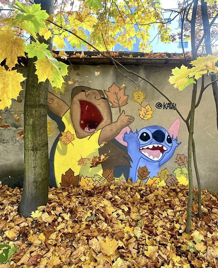 Что же касается самого Каву, то в данном посте вы увидели лишь малую часть его работ. Но перегружать и так уже довольно большой пост ещё 50 его работами я не буду – просто ловите напоследок героев мультфильма Лило и Стич, задорно играющих с кучей реальных и не очень осенних листьев.