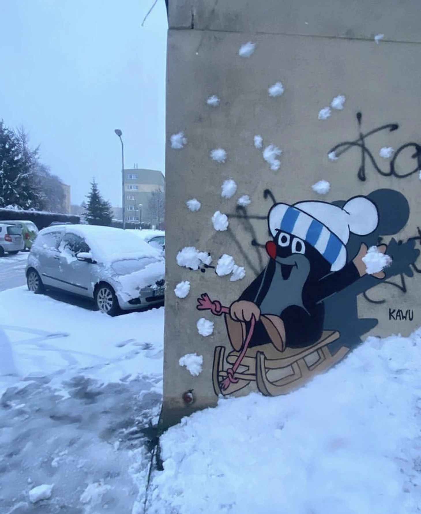 К проблеме уборки снега зимой Каву подошёл несколько креативнее, чем это сделали активисты в Питере, которые просто написали на огромном сугробе во дворе «Навальный» (правда своей цели они достигли – почти сразу же двор был очищен от снега) – он изобразил известного крота из знаменитого чешского мультика, съезжающего на санках с одного из неубранных сугробов.