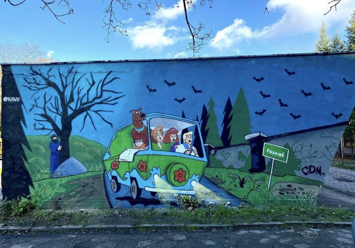 Еще один рисунок со Скуби-Ду и сидящими вместе с ним в фургоне Велмой Динкли, Шэгги Роджерс, Фредом Джонсом и Дафни Блейк. Веселая компания едет в Познань (о чем нам говорит дорожный указатель), а также на рисунке Каву нарисовал самого себя, стоящего позади них за деревом.