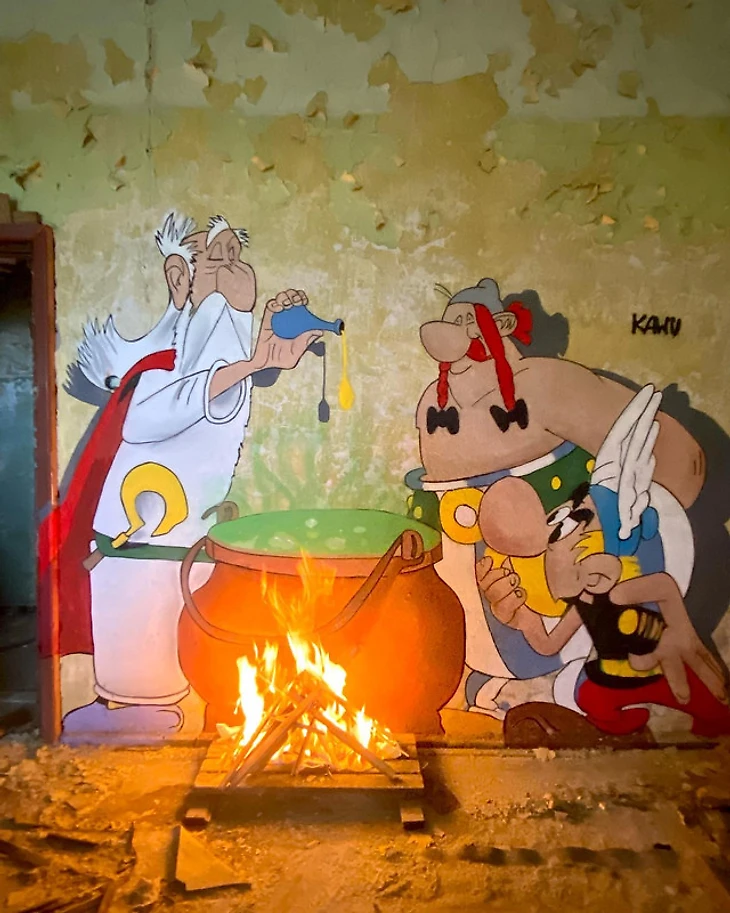Одной из первых уличных работ поляка стало изображение Астерикса и Обеликса у котла на огне, причём огонь был настоящий, разведенный с помощью обычного костра. Эта работа, нарисованная в заброшенном доме, была призвана привлечь внимания к проблеме беспризорных детей, которые зачастую ошиваются в таких местах и приготавливают еду подобным способом.