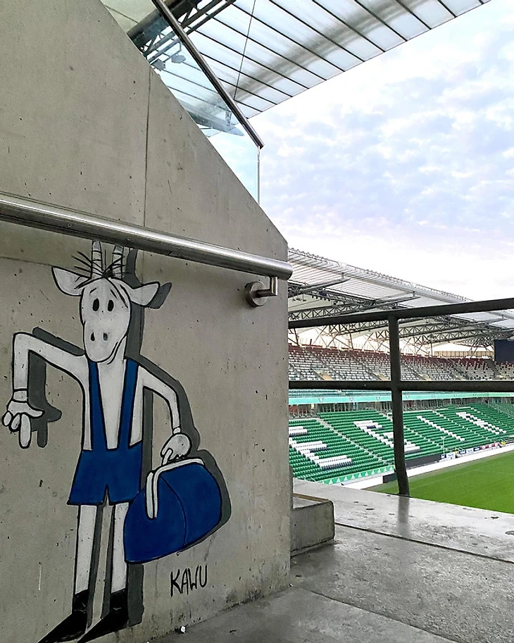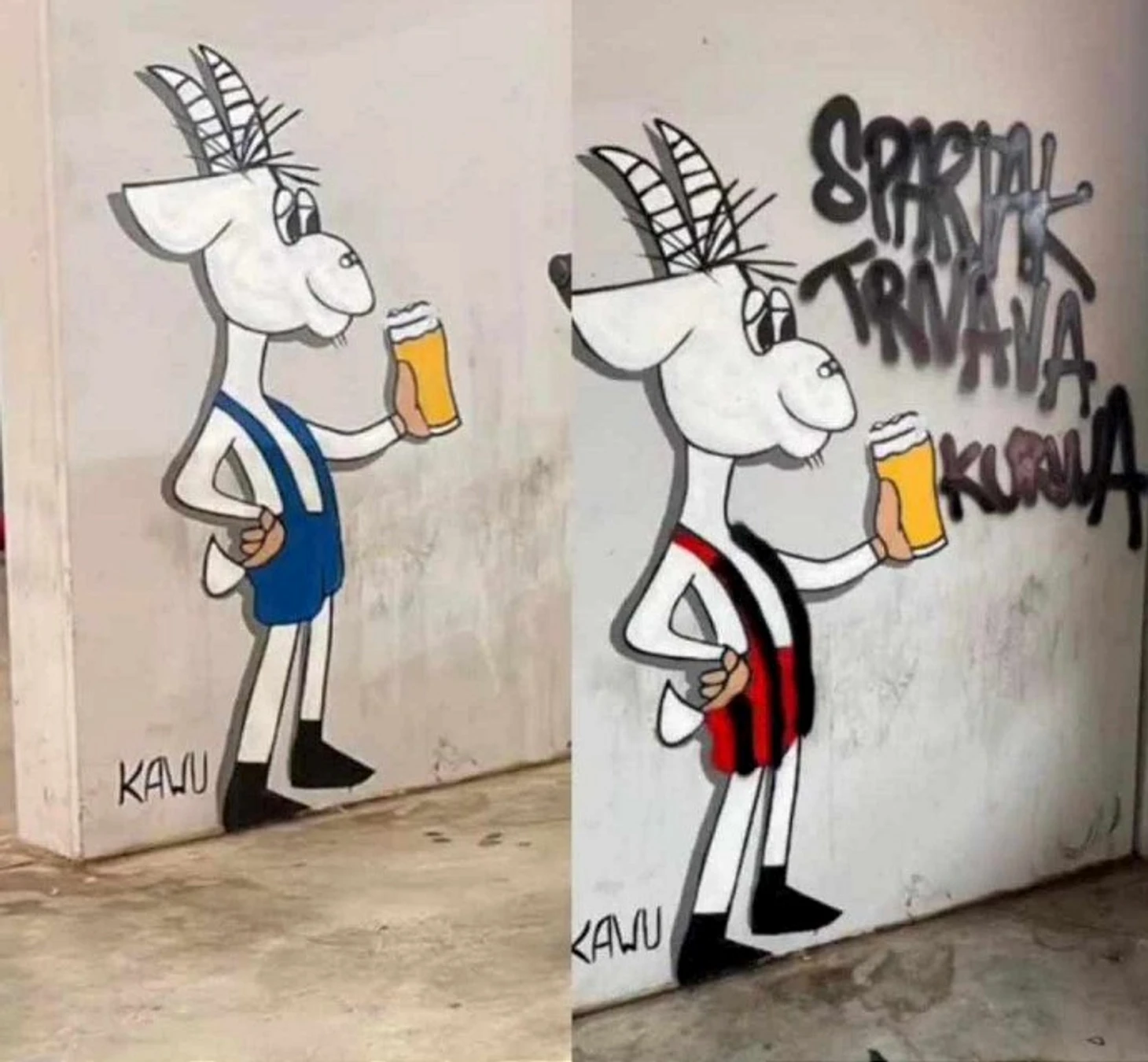 Спустя всего лишь несколько дней козёл Матолек появился не просто на другом стадионе, но и в другой стране – на стадионе имени Антона Малатинского в словацком городе Трнава, где «Леху» предстояло сыграть с местным «Спартаком». Как и «Легии», «лехитам» также предстоял непростой отбор через квалификацию Лиги Конференций. На рисунке Матолек стоит на фанатской трибуне и с нескрываемым удовольствием смотрит на футбольное поле. В руках (лапах, копытах – не суть важно) у него – бокал пива, которого в Словакии производят не меньше, чем в соседней Чехии.
