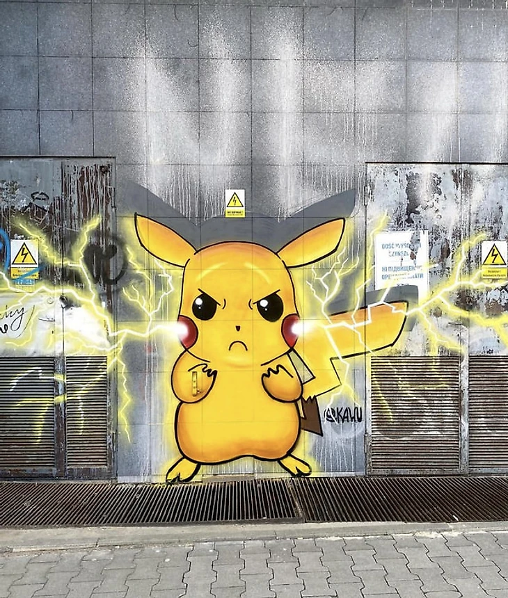 А вот Пикачу – тот самый покемон, который накапливает электричество в своих щёках и при необходимости бьёт электрическим разрядом. Где Каву его нарисовал? Разумеется, на стене электроподстанции.