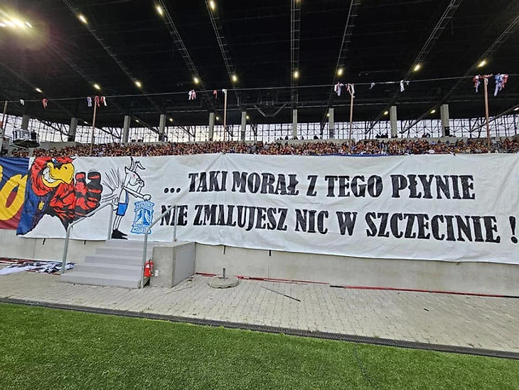 Что же касается матча «Погонь»-«Лех», то местные фэны довольно быстро превратили поимку «Каву» в повод поглумиться над фанатами гостей: они нарисовали баннер, на котором гриф (символ «Погони» и Щецина в целом – он изображен в том числе на городском гербе) бьет козла Матолека, держащего в руках перевернутую эмблему «Леха». Причём Матолек нарисован именно таким не просто так – при «поимке» у Каву изъяли такой же эскиз и трафарет (только с перевёрнутым логотипом «Погони» вместо «Леха») будущего граффити на стадионе в Щецине.