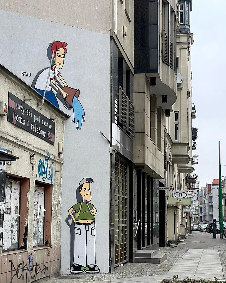 Разумеется, что творчество такого талантливого художника не могло остаться без внимания властей. И очень хорошо, что это внимание носило исключительно позитивный характер – то есть Каву не преследовали за его творчество и его «высказывания» как на политические темы, так и на тему работы чиновников, а привлекали для того, чтобы сделать Познань чуть ярче и чуть лучше. В качестве примера ловите фото одного из обычных городских зданий: серая, убогая стена с несколькими уродливыми надписями на ней.