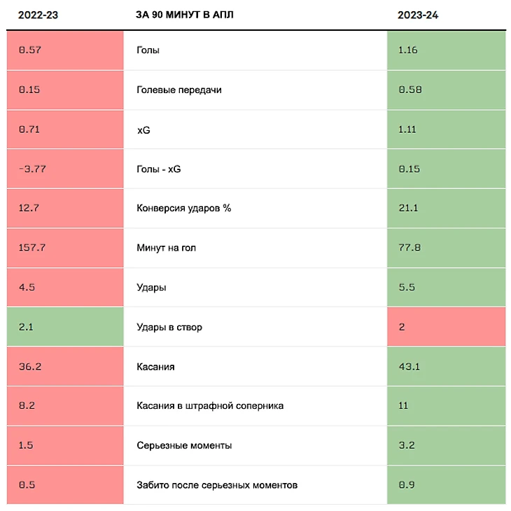 Размер выборки в этом сезоне может быть небольшим, но цифры говорят сами за себя: Нуньес превзошел свою кампанию 2022/23 годов по всем ключевым показателям Opta в Премьер-лиге, кроме одного.