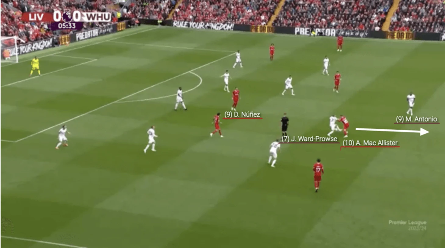 Его усердие в обороне было очевидно уже на шестой минуте. Здесь Нуньес начеку: Джеймс Уорд-Проуз перехватывает мяч у Мак Аллистера и играет на Микаэла Антонио в направлении ворот.