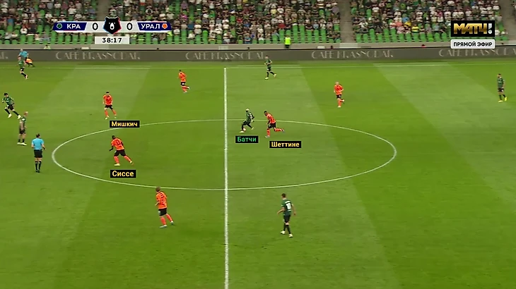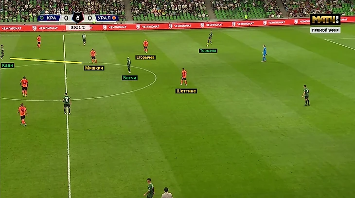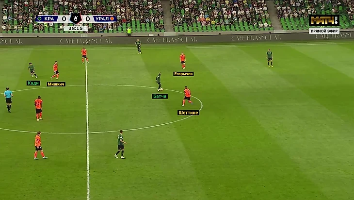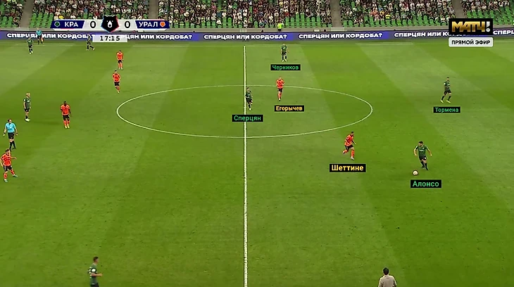 Сначала «Урал» оборонялся осторожнее и Егорычев старался успевать за опорником, несмотря на то, что он играл на одной линии с Шеттине. В таких ситуациях «Краснодар» легко создавал чистый мяч для одного из центральных защитников и следовал длинный пас вперёд.