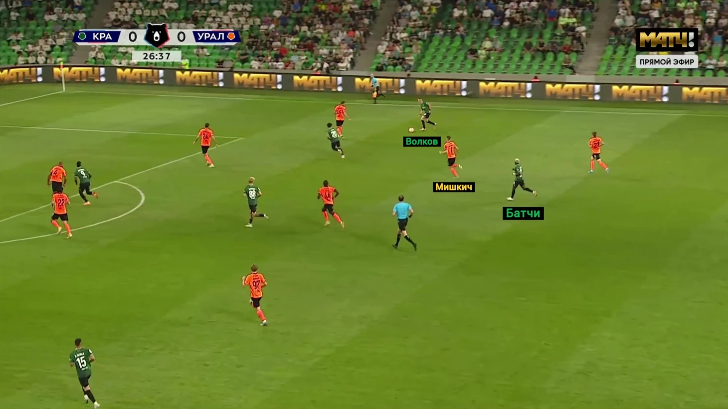 «Краснодар» почти не испытывал проблем в первой стадии развития атаки. На правом фланге Волков уходил вперёд, поэтому в эту зону смещался Черников или Сперцян. Второй всегда действовал на позиции шестёрки во время владений.