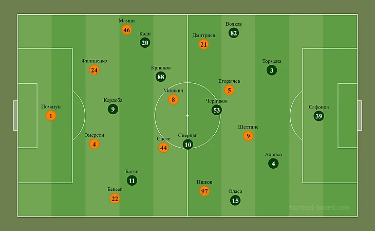Очевидно, замена Дмитриева в первую очередь была связана с плохой игрой без мяча. Игорь постоянно оказывался между Торменой и Волковым при обороне. Плохой выбор позиции приводил к тому, что защитники очень легко проходили через его зону. В итоге оба попали в тройку лучших по продвижению мяча.